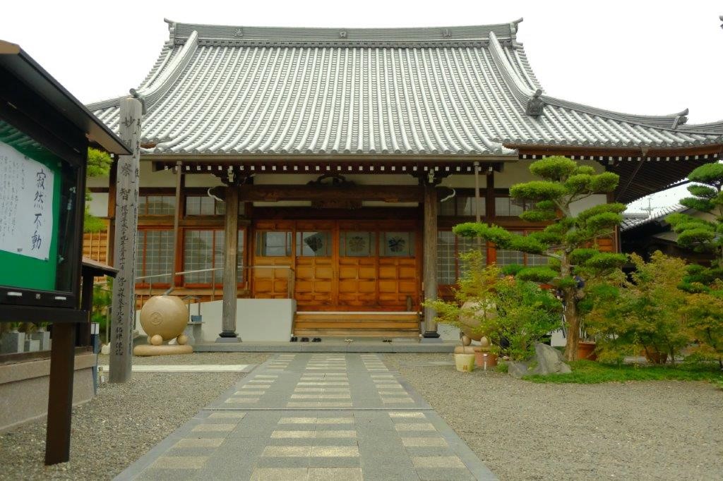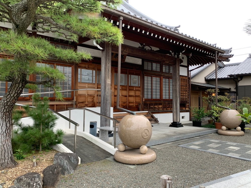 東名高速道路焼津インター近く、焼津さかなセンター等の商業施設や住宅に囲まれた地域にある明るいお寺。