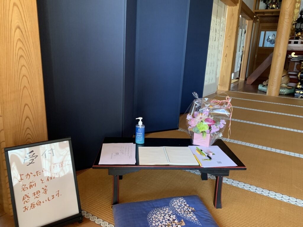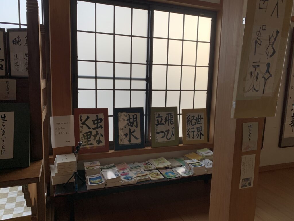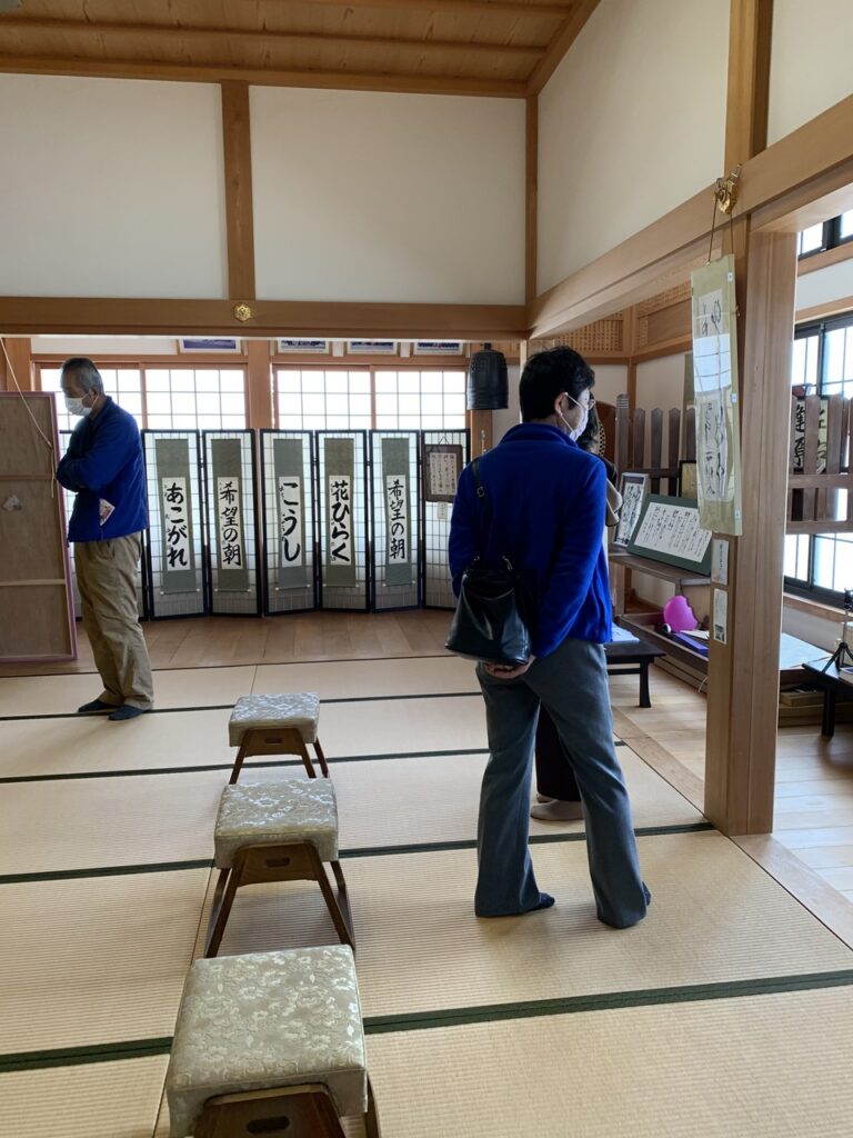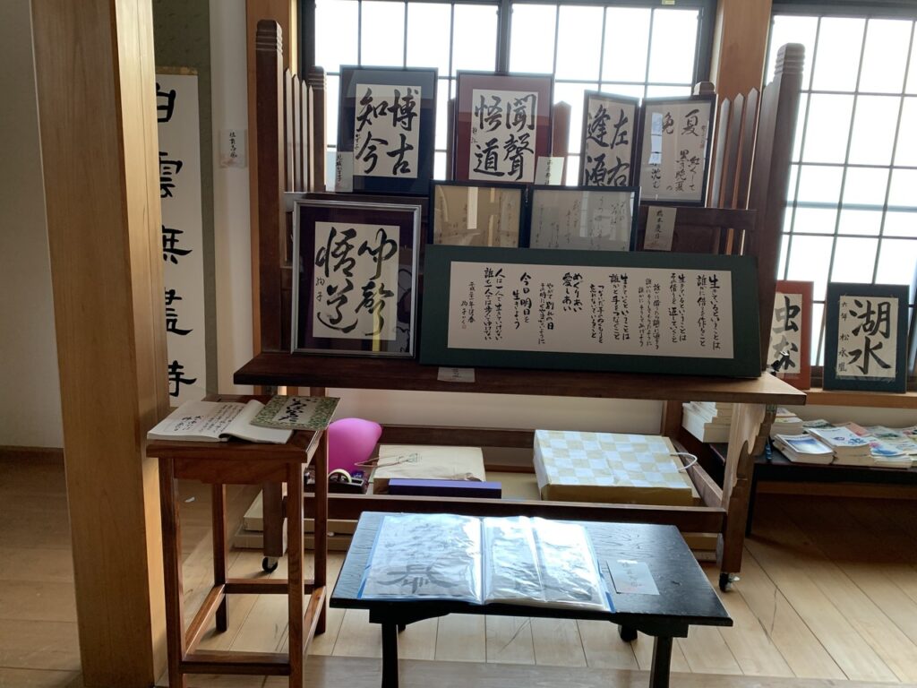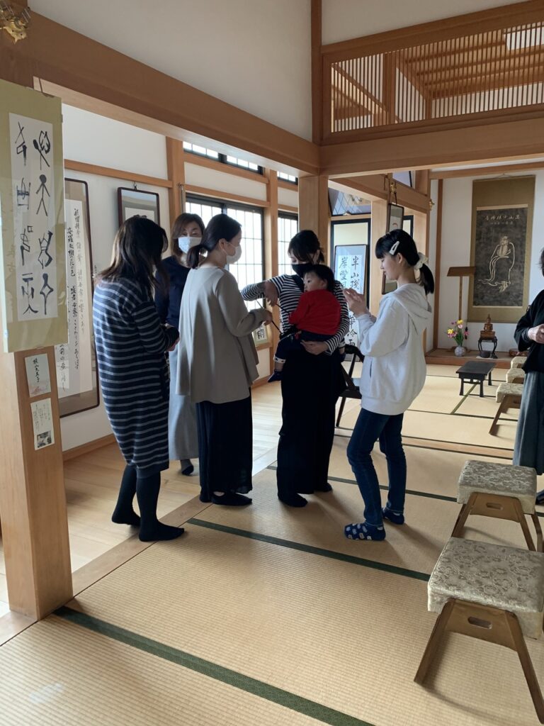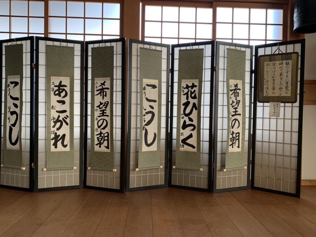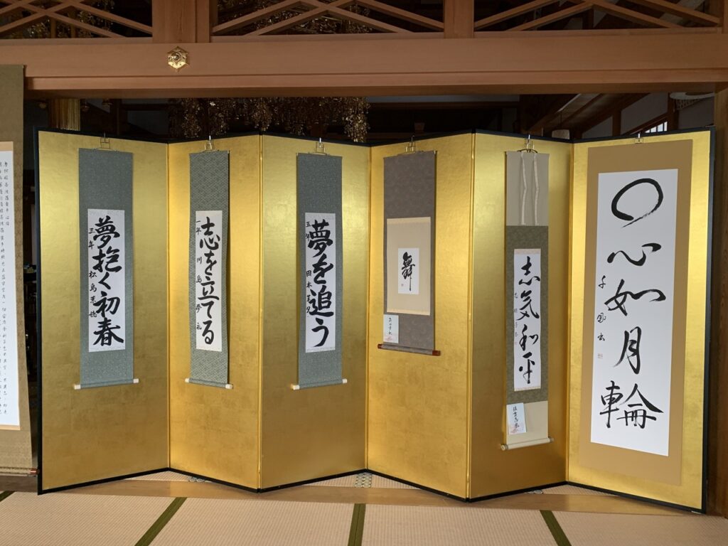 作品の展示は幼稚園生から九十歳の方まで幅広く、飾る場所は鴨居にフックをかけたり、お寺の金屏風にフックで飾ったり、円泉寺さんで借りたついたてにフックで掛けたり、棚は施餓鬼棚をうまくつかいました?