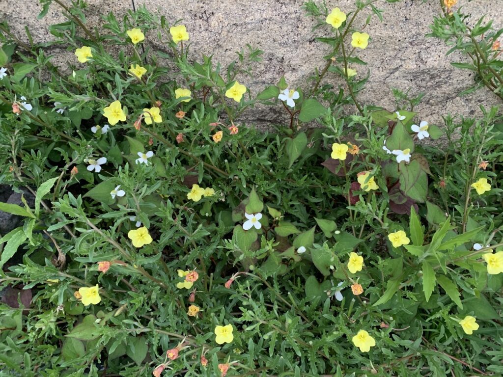 石の門の右側の白壁のまえは自生してくれるどくだみ草と、月見草が花盛りです。