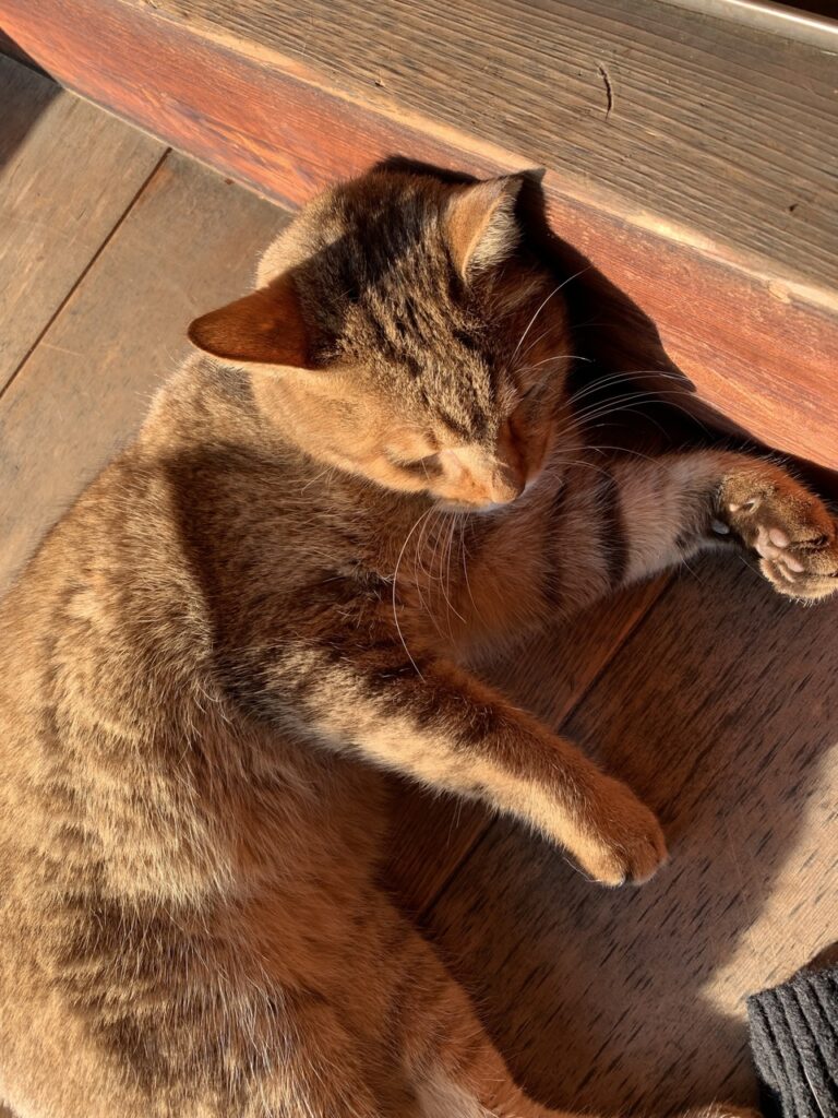 本堂の入り口で日向ぼっこする少し虎に似ている山根。
