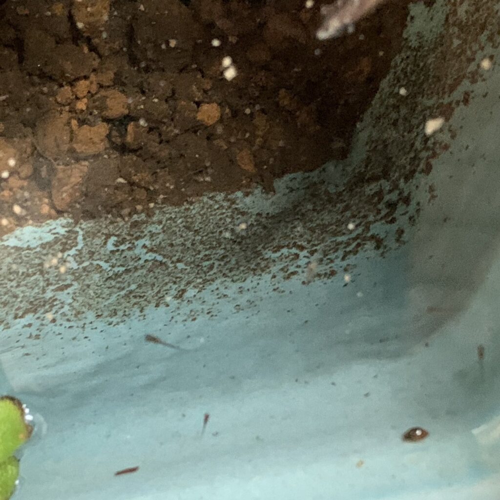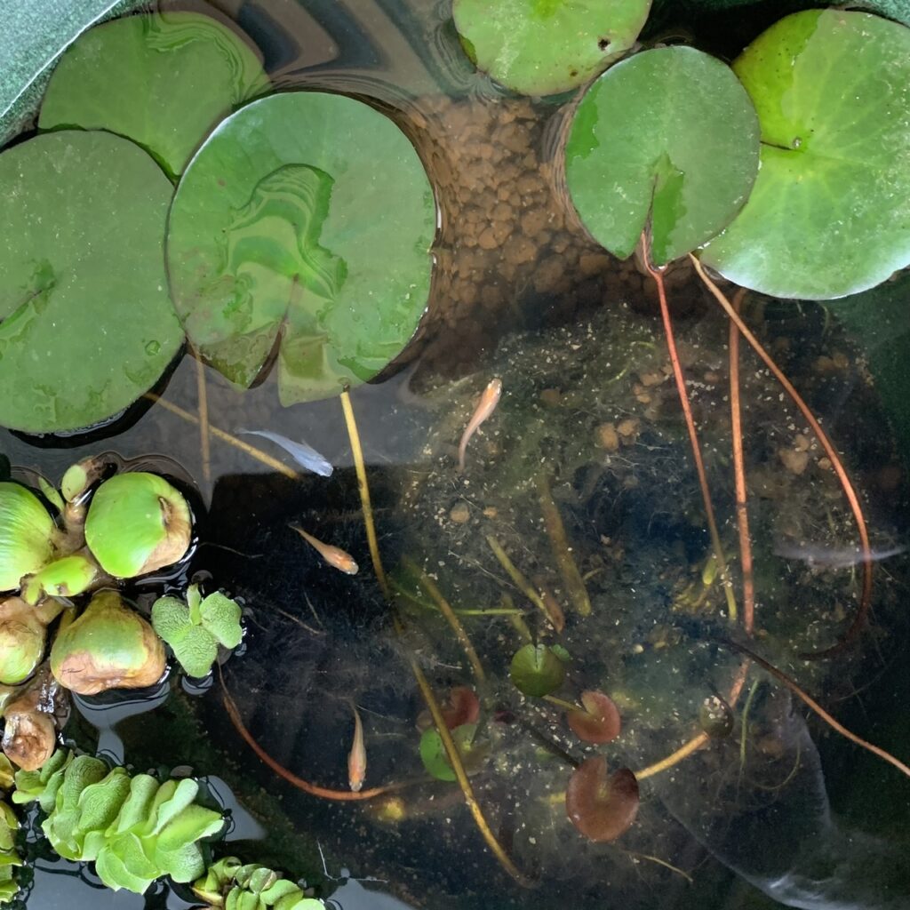 メダカは卵を共食いしてしまうので、見つけたら別の鉢に移すということで、新しい鉢を買って、浮草を入れて卵らしいものを移しておきました。