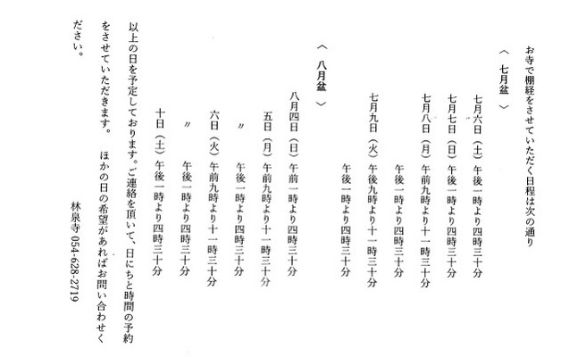 今年も例年通り棚経に回ります。よろしくお願いいたします。