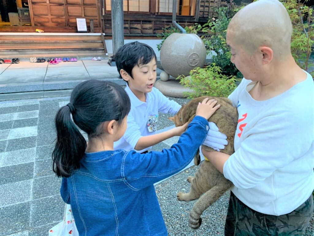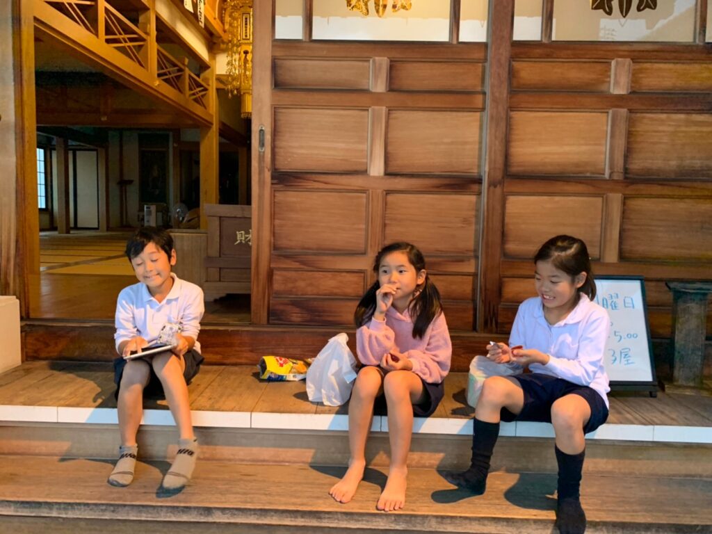 終わったら外でお菓子を食べたり、やーや(友禅住職のニックネーム)とお話をしたり、皆で遊んだりして自由に過ごしています。